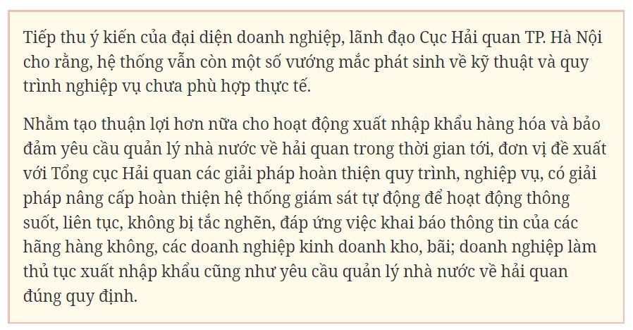 Đến nay, 100% các hãng hàng không đã gửi thông tin tới Cổng một cửa quốc gia. Hệ thống quản lý giám sát tự động đã kết nối toàn bộ các kho hàng không tại Cảng Hàng không quốc tế Nội Bài. Tỷ lệ xử lý tự động của hệ thống đạt ổn định trên 99,5%. Tại Cảng hàng không quốc tế Nội Bài, bình quân mỗi ngày có trên 5.300 lô hàng được làm thủ tục, tất cả đều được quản lý, giám sát thông qua hệ thống. Thời gian kiểm tra, giám sát, thông quan mỗi lô hàng giảm từ 3-6 giờ xuống trung bình dưới 10 phút.Doanh nghiệp mong muốn cơ quan hải quan tiếp tục cải cách hơn nữa