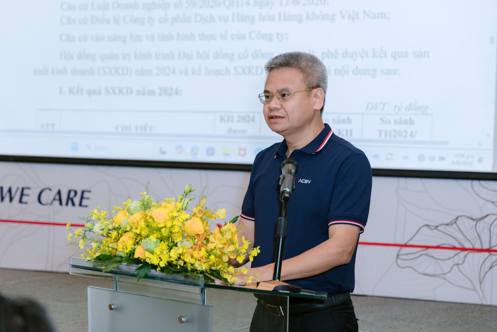 Phát biểu tại Đại hội, ông Nguyễn Đức Hùng – Chủ tịch Hội đồng quản trị nhấn mạnh những khó khăn, thách thức Công ty phải đối mặt trong năm 2024. Tuy nhiên, nhờ sự ủng hộ của các cổ đông, sự chỉ đạo sát sao của Hội đồng quản trị cùng nỗ lực không ngừng của Ban điều hành và toàn thể cán bộ nhân viên, Công ty ACSV đã đạt được những kết quả tích cực, tiếp tục duy trì đà tăng trưởng cả về sản lượng, doanh thu và lợi nhuận so với cùng kỳ 2023. Ban điều hành Công ty đã tập trung nâng cấp cơ sở hạ tầng và đẩy mạnh chuyển đổi số, từng bước số hóa quy trình khai thác nhằm nâng cao hiệu quả hoạt động. Song song với đó, ACSV chủ động triển khai mô hình logistics xanh, thay thế dần phương tiện chạy dầu bằng xe điện và áp dụng các giải pháp tiết kiệm năng lượng, giảm phát thải trong toàn bộ hoạt động khai thác. Các nỗ lực này không chỉ góp phần nâng cao chất lượng dịch vụ, mà còn tạo dựng hình ảnh thương hiệu chuyên nghiệp, hiện đại và thân thiện trên thị trường logistics hàng không.