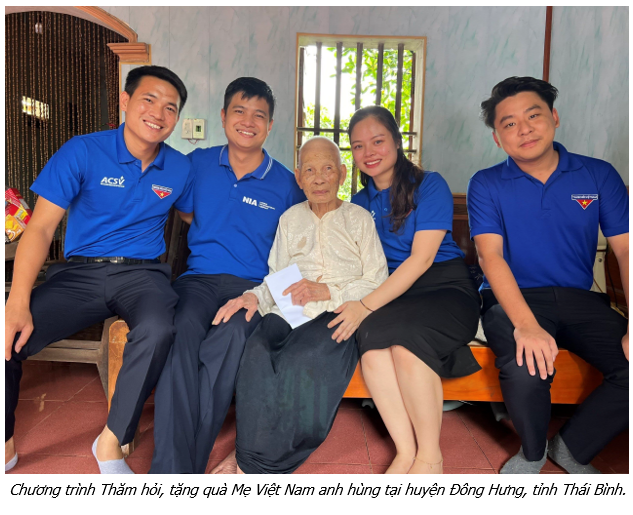 Bên cạnh đó Đoàn Thanh Niên cơ sở Công ty ACSV đã phối hợp với Đoàn Thanh Niên cảng HKQT Nội Bài tổ chức nhiều hoạt động thiết thực, có ý nghĩa nhân văn sâu sắc như: “Thăm hỏi, tặng quà các Mẹ Việt Nam anh hùng” tại Huyện Đông Hưng, Tỉnh Thái Bình; “Thắp nến tri ân” tại nghĩa trang Liệt sỹ xã Mai Đình, Huyện Sóc Sơn; “Tặng quà cho người có công và thắp nến tri ân các Liệt sỹ” tại khu di tích lịch sử Truông Bồn, tỉnh Nghệ An nhằm tưởng nhớ, tri ân những Chiến sỹ và đồng bào đã hy sinh, cống hiến một phần máu thịt của mình trong công cuộc bảo vệ Tổ quốc.